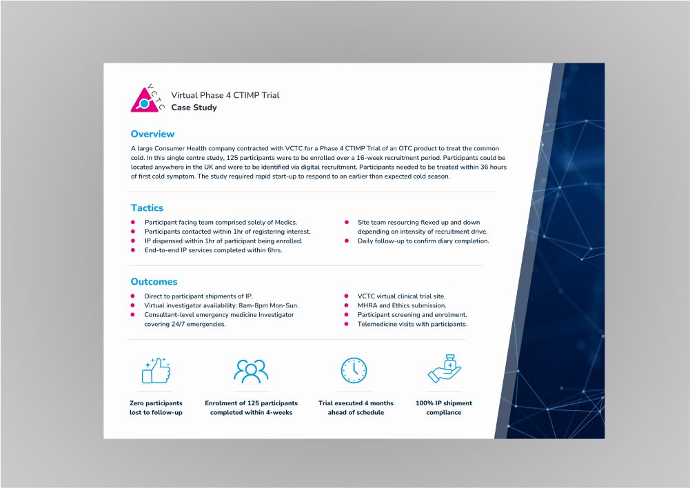 VCTC is a UK based patient centric clinical trial site that eliminates the burden of participation and facilitates the rapid recruitment of patients. Our pioneering processes take clinical trials to our patients, providing access to all, generating diversity and quality data through a compassionate, expedited virtual clinical trial process.